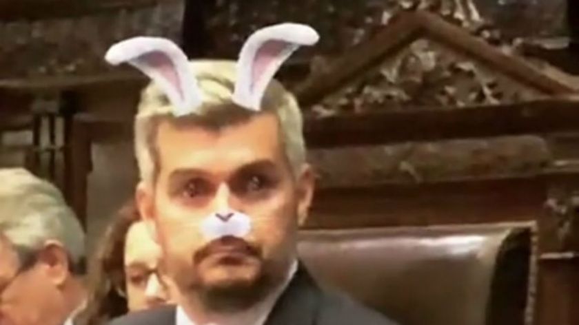Por momentos también filmaba a sus compañeros de banca, pero luego volvía a hacer foco en el rostro del jefe de Gabinete y le ponía los efectos que permite la red social.